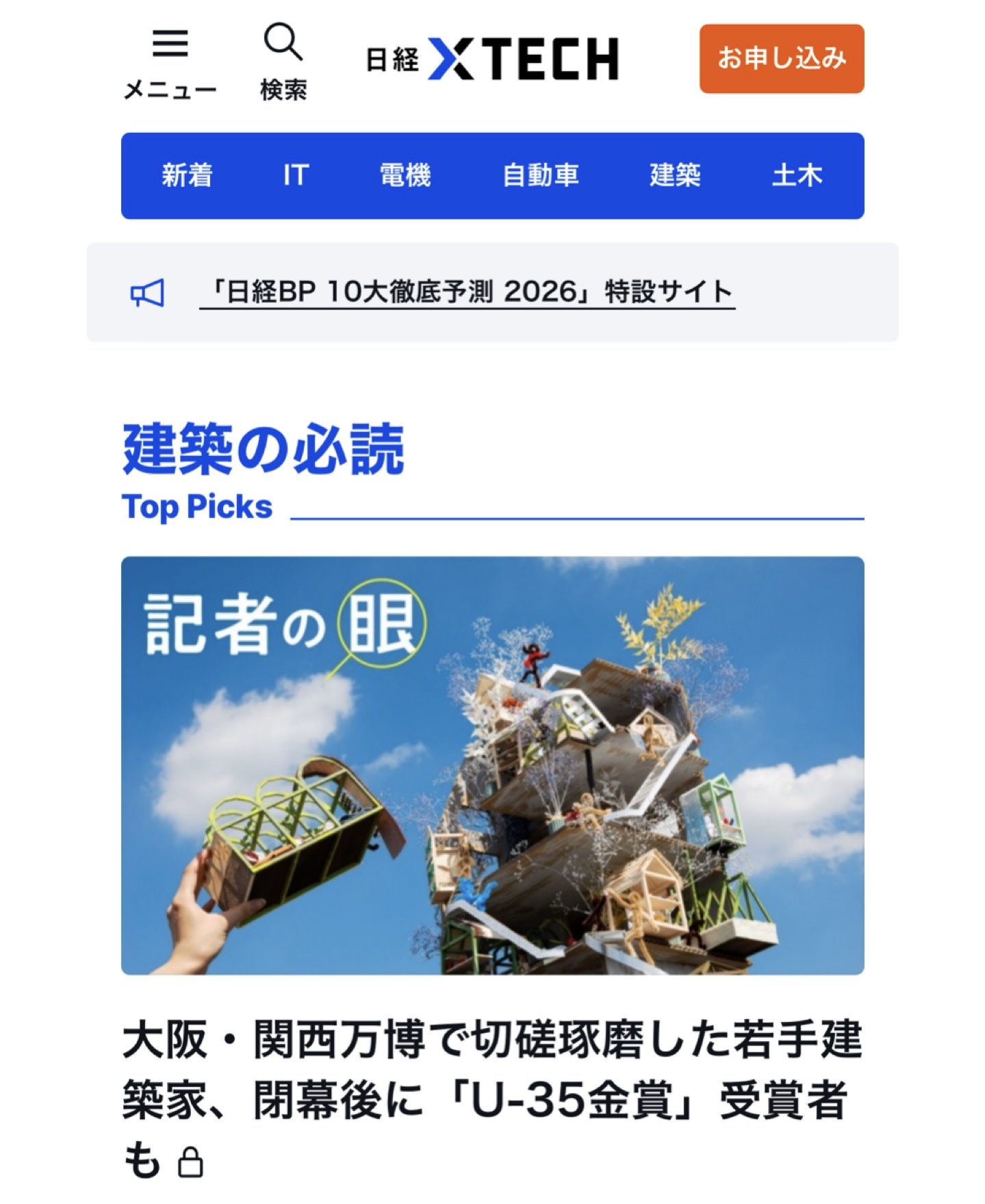 interview information 投稿者:mumu 2025年12月6日2026年1月15日 日経クロステックさんに取材いただきました! 大阪・関西万博で切磋琢磨した若手建築家、閉幕後に「U-35金賞」受賞者も